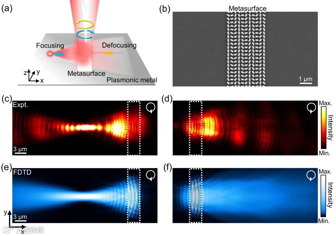 方向的波矢补偿,进而调控所产生的表面等离激元的波前,把它们聚焦到一点。再考虑到几何相位的自旋依赖特性,该超构表面耦合器的功能如图2(a)所示,在左旋圆偏振光的入射下,能够把入射光转化为表面等离激元并聚焦到片上一点,而在右旋光下,则会激发相反方向传播的发散波前的表面等离激元。通过预先设计的一个满足完美半波片性质的高效几何相位超构原子,基于几何相位原理构建了满足式(1)相位分布的超构表面真实结构,图2(b)为相应的样品SEM照片。而后利用泄漏模显微测试系统对该样品在左右旋光分别入射下产生的表面等离激元进行测试成像,结果如图2(c,d)所示,样品分别产生了向左聚焦与向右发散的表面等离激元。图2(e,f)为相应的模拟结果。可以看到,设计、实验、仿真三者相互吻合,验证了该超构表面耦合器的表面等离激元激发聚焦能力。