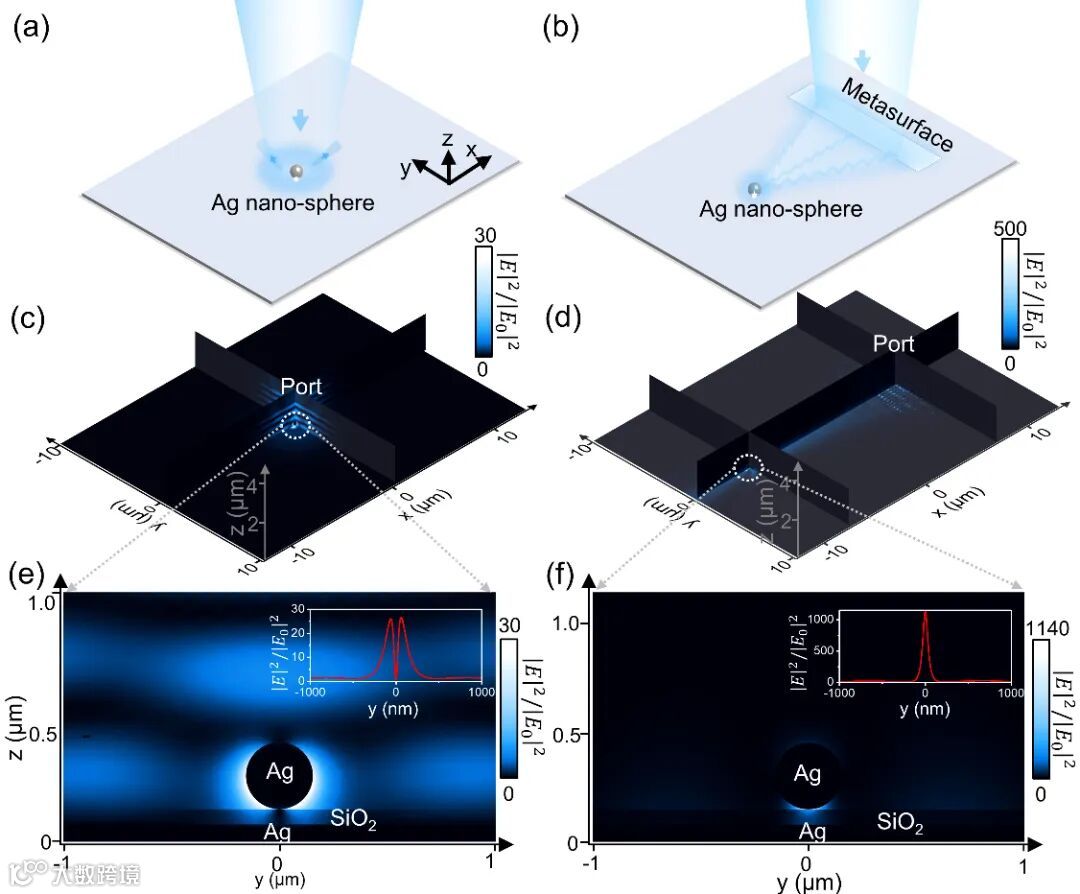 图5 直接激发法与超构表面耦合法激发等离激元纳腔的对比。(a,b)直接激发法与超构表面耦合法激发等离激元纳腔的示意图。(c,d)模拟得到的两种激发方法的整体场分布效果对比。(e,f)模拟得到的两种激发方法的对应的银纳米球中心𝑦 − 𝑧截面上的场分布。它们中右上角的曲线图是这两种情况下银纳米球底部截线上的场增强数据,其中直接激发法最大场增强为28倍左右,超构表面耦合法最大为1140倍左右。