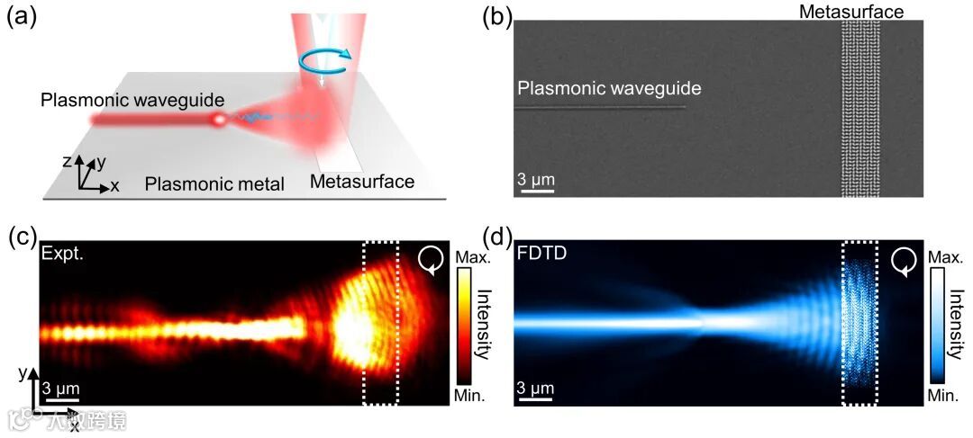 图3 超构表面耦合等离激元波导的设计与表征。(a)耦合体系设计示意图。(b)样品照片。(c,d)超构表面在左旋光入射下耦合波导的泄漏模实验测试结果与全波仿真结果。