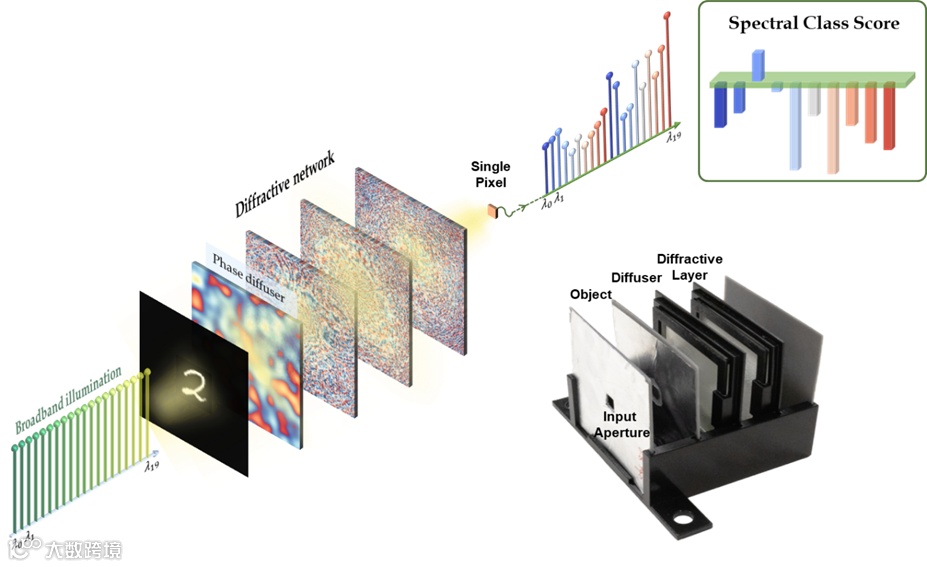 一个宽带单像素衍射光学网络将未知随机散射介质中的物体的空间信息映射到输出像素孔径的光谱能量中。光谱能量对应的分类分数揭示了随机散射介质后面的输入物体的类型。图片来源: Ozcan Lab @ UCLA.