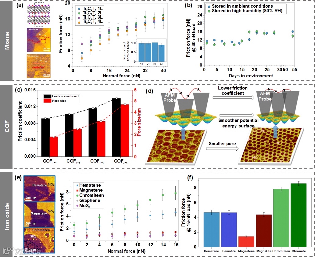 图6 (a)不同厚度的Mxene纳米片层在摩擦力测试;(b)MXene 纳米片层表面摩擦力在高湿度环境下随时间的演化规律;(c)COF的摩擦系数对其孔径结构的依赖性;(d)COF表面纳米摩擦学机理模型;(e)非范德华材料二维铁氧化物和范德华材料的摩擦力比较;(f)二维和三维状态下的非范德华铁氧化物摩擦力对比。