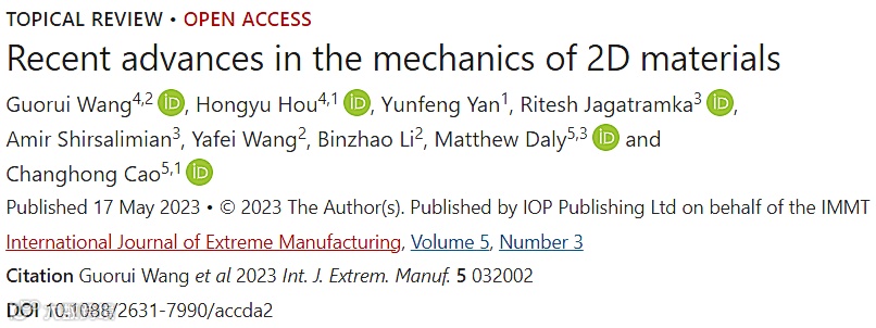 Wang G R, Hou H Y, Yan Y F, Jagatramka R, Shirsalimian A, Wang Y F, Li B Z, Daly M, Cao C H. 2023. Recent advances in the mechanics of 2D materials. Int. J. Extrem. Manuf. 5 032002.
