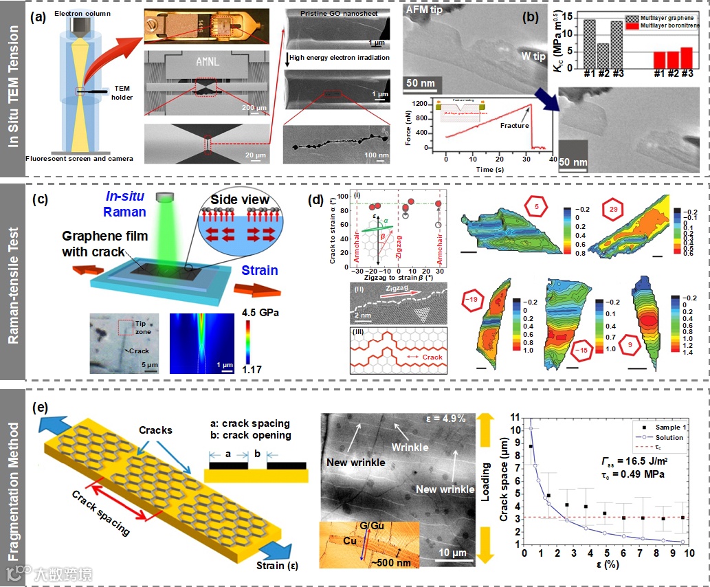 图4 (a)氧化石墨烯纳米片的原位透射电镜拉伸试验;(b)V形缺口二维纳米片的原位透射电镜断裂测试;(c)拉曼光谱表征高分子基底上石墨烯的裂纹尖端应力分布;(d)石墨烯片层不同晶向的裂纹扩展方向;(e)拉伸试验过程中石墨烯薄膜表面形成的褶皱和裂纹,以及基于裂纹间距测量的石墨烯断裂韧性。