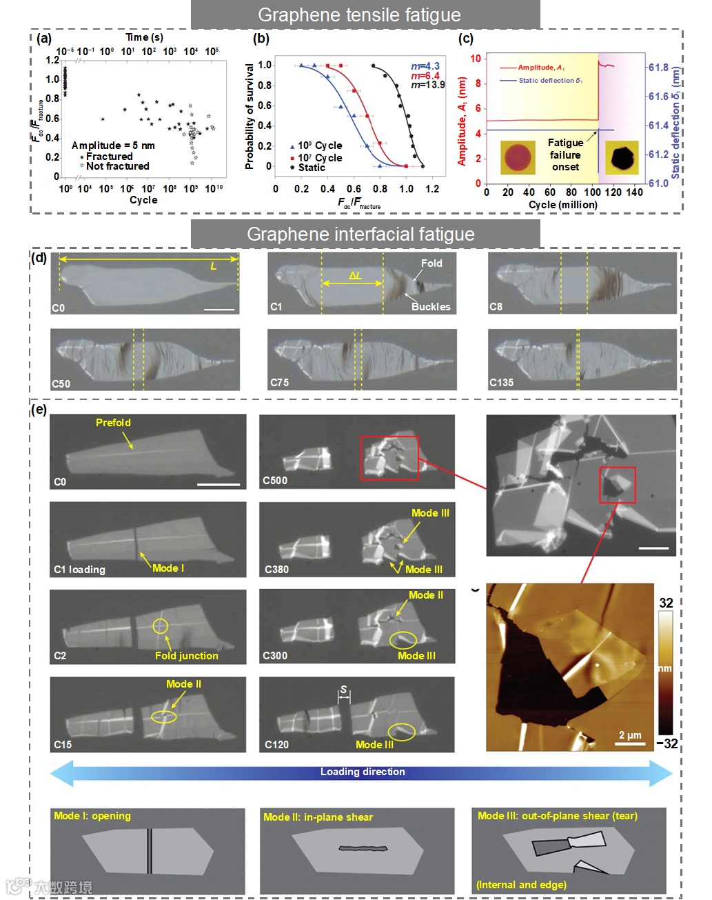 材料在远低于极限抗拉强度的循环载荷作用下会产生机械疲劳,理解材料的疲劳失效机制对评估其应用中的长期服役性能具有重要知道作用。有趣的是,不同于传统材料,二维材料的疲劳是大范围突变的,往往通过缺陷附近应力介导的键重构实现,并没有损伤累积。其中单层石墨烯的疲劳寿命在平均应力为71 GPa、应力幅值为±5.6 GPa的条件下高达109 次,比迄今为止报道的任何材料都要高,如图5所示。在石墨烯中引入缺陷或者含氧官能团之后,疲劳寿命显著降低,失效机制也转变为局部渐进性的疲劳损伤。此外,二维过渡金属硫化物(如MoS2和WSe2)表现出极为分散的疲劳寿命,其原因在于材料的疲劳失效不止取决于缺陷的密度,还有缺陷的类型、构型、分布以及热涨落的影响。