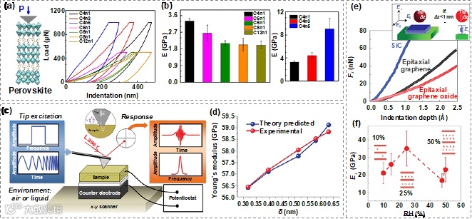 图3 (a)二维层状钙钛矿典型的压痕曲线;(b)钙钛矿烷基链长和层数对面外弹性模量的影响;(c)电化学循环过程中的原位接触共振AFM测量;(d)面外弹性模量与压痕深度的关系;(e)单晶SiC、10层厚外延石墨烯和10层厚外延氧化石墨烯的亚埃级分辨压痕曲线;(f)氧化石墨烯面外弹性模量随相对湿度变化的趋势。