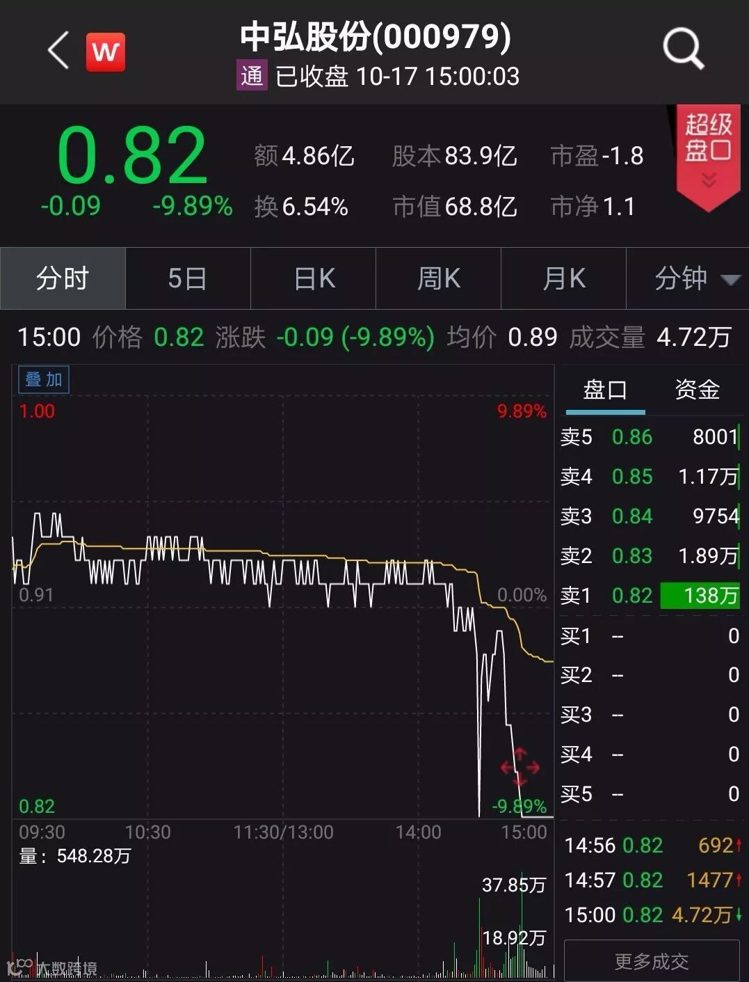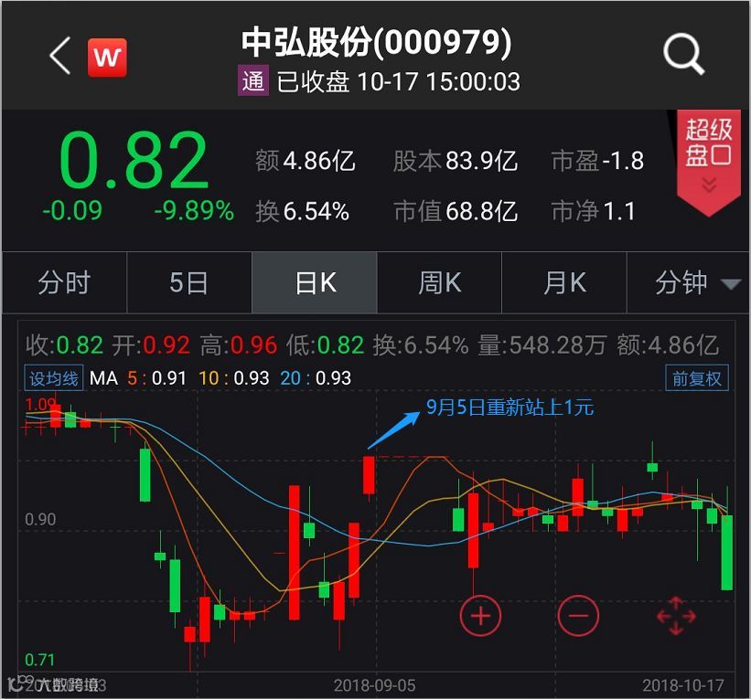 按照今日收盘价0.82元计算,即使明天(10月18日)中弘股份冲击涨停,股价最多也只能到0.9元。届时,公司股价连续20个交易日收盘价低于1元,根据有关规定,交易所有权终止公司股票上市交易。