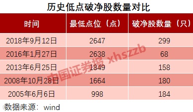 对比几次历史大底数据来看,目前破净股数量已经创下历史新高。如2016年1月27日2638点低点时,两市只有68只股票破净;2005年998点时破净股数量为184只,占全部A股总数的13.65%。