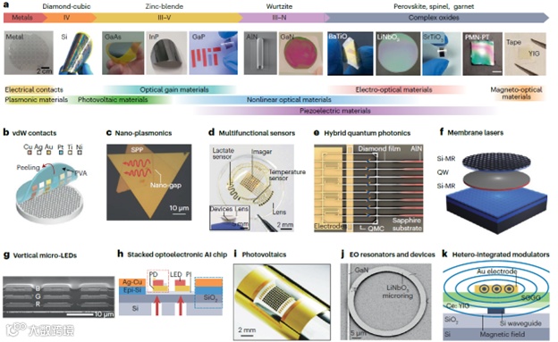 近年来,基于III-V族(例如GaAs和InP等)的半导体材料,在激光器和探测器等领域展现出了优异的性能[2];基于薄膜铌酸锂(LiNbO₃)的集成光子平台,近期在电光器件、声光器件、以及非线性光学领域大放异彩[3,4];基于石榴石类晶体(YAG, YIG)的磁光材料可实现非互易的光传输[5],基于金属卤化物钙钛矿(perovskites)的薄膜材料在有源光器件和激子物理等领域也具有诸多突出优势[6]。如果可以将这些不同类型的功能型光学材料有序的集成在同一个光学平台上,则可以实现诸多创纪录的高性能光电子器件并探索多功能的光学应用。