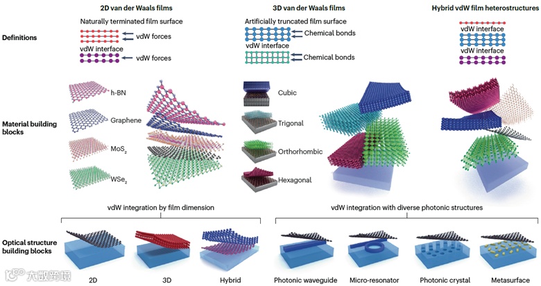 而光学的范德华集成(van der Waals integration)策略则不受上述条件的制约[1,7]。此概念一开始为研究二维材料(2D materials)以及范德华异质结(van der Waals heterostructures)的学者所提出,通过将预先准备的好的光学薄膜通过物理转移和组合的方式,与二维材料或其他结构进行组合,并通过范德华力相连接,便可以任意的设计具有不同材料、不同衬底、不同结构的人工异质结构,进而实现多种光电子应用。