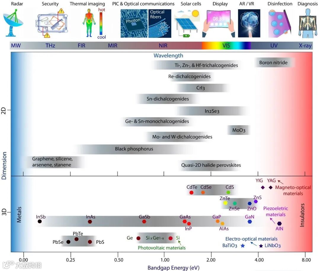 尽管III-V族材料在多方面具有极好的光电特性,但是其昂贵的造价是阻碍其像硅基光子学那样更广泛发展的因素之一。目前绝大部分的应用中,起到功能性作用的只有材料上层约纳米到微米量级的器件层;而占生产成本相当大比重的昂贵的衬底层却大部分只起到机械支撑的作用。而使用二维材料包裹的远程外延生长(remote epitaxy)和范德华外延生长(van der Waals epitaxy)技术可以循环的使用同一个衬底材料来多次制作可分离的三维光学薄膜[17],因此可以大幅的降低非硅光学材料的生产成本来促进多种新型光学材料的商业应用。