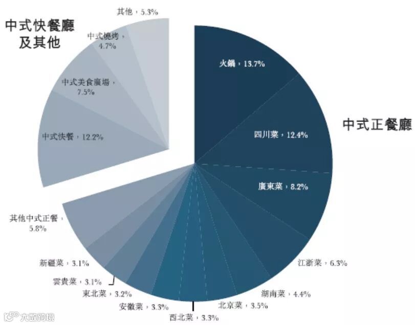 中国餐饮服务市场主要由三部分组成,即中式餐饮、西式餐饮和其他餐饮,中式餐饮是最大的组成部分,2017年市场份额为80.5%,而在所有中式菜品中,火锅占有最大市场份额,按2017年收入计算,其市场份额为13.7%。