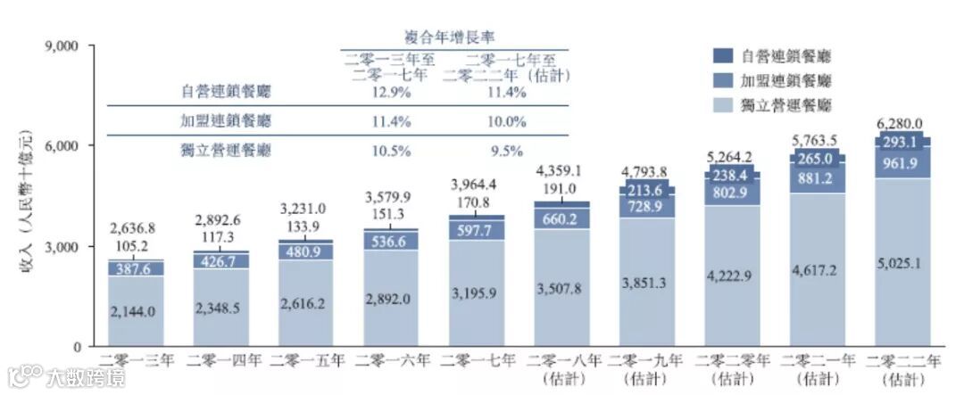 海底捞招股说明书中介绍,中国餐饮服务市场近年来稳步快速增长,总收入由2013年的26368亿元增至2017年的39644亿元,复合年增长率为10.7%。