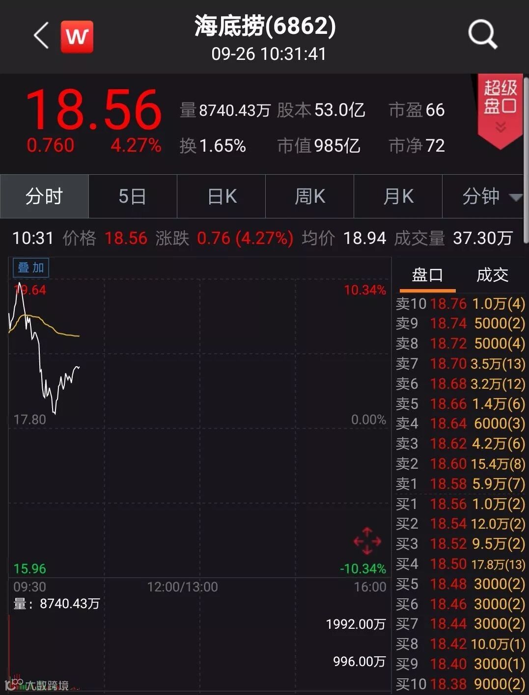9月26日,海底捞在港交所上市。作为港股史上截至目前入场门槛最高的新股,海底捞今日上市高开5.6%,随后一路高歌猛进,一度涨逾10%,市值突破千亿港元。