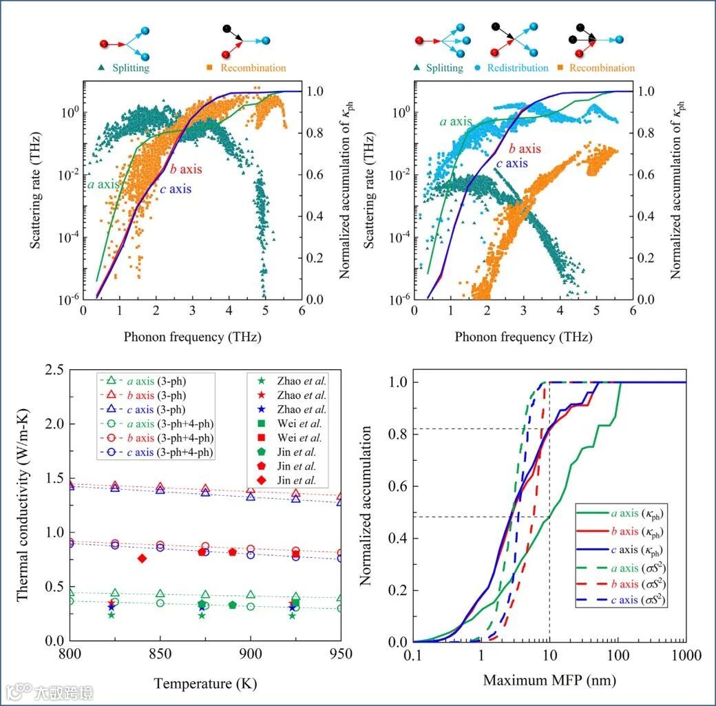 该工作基于第一性原理计算及求解线性化波尔兹曼方程,逐模地研究高温相硒化亚锡声子的输运性质,为理解硒硒化亚的高热电优值与后续的纳米结构工程优化提供了理论基础。重要结果如下:(1)考虑有限温度引起的晶格非谐性,克服基态密度泛函理论导致的热不稳定性,获得准确的高温相硒化亚锡声子谱;(2)发现四声子耦合会使得面内及面外热导率额外下降38%及19%,其中以再分布过程所贡献的热阻最为显着,得到的晶格热导率与实验值更加稳合;(3)发现材料的特征尺寸约在10纳米时,可以最大限度降低晶格热导率而不影响功率因子,为使用纳米结构工程优化硒化亚锡的热电优值提供理论上的依据。