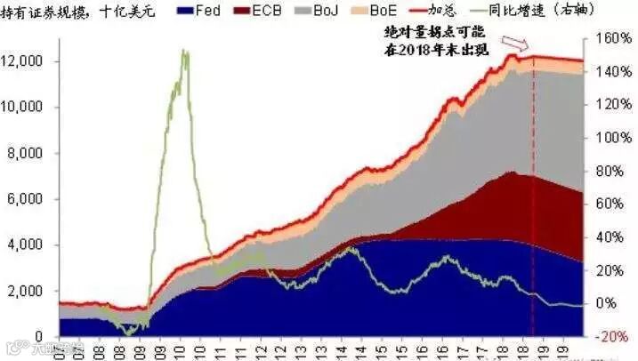 由此可见,发达经济体央行的资产负债表整体规模可能在2018年底前后显现持续减少态势,自金融危机结束以来,全球流动性拐点将至。