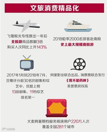 文化、娱乐和旅游等精神和体验消费越来越优质精细,飞猪前往北极、南极旅游的游客人数连年增加,游客甚至可以在飞往芬兰的航班上用支付宝扫码购物。优酷以13部剧集、11档综艺“霸屏”去年年初至今的豆瓣评分前30名,《我不是药神》成为年度口碑之作,票房收入约为31亿元。看演唱会、话剧、芭蕾舞剧成为人们暑期消费的新热点。