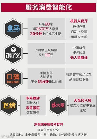 数字和智能技术富有能服务消费百花齐放,重要性加速提升。被视为美好生活代名词的盒马鲜生目前已扩大至88家,超2600万消费者可享受线上下单、帝王蟹、波士顿龙虾、挪威三文鱼30分钟新鲜上门。在上海嘉定的盒马机器人餐厅,拣菜、炒菜、上菜都有机器人“员工”的身影。今年7月,饿了么在上海一个城市的单日成交额冲破亿元大关,除了外卖,星巴克咖啡、鲜花、珠宝、甚至宠物食品都能配送上门,无人机已经投入商业使用。无纸化餐厅、无纸化演出入场蔚然成风,繁琐的消费前手续可在手机一键完成;逐渐装上“大脑”的智慧门店、智慧餐厅、未来酒店和未来景区纷纷涌现。直到深夜23点后,刷支付宝坐公交、蚂蚁森林、水电煤缴费等服务依然活跃在城市各个角落。
