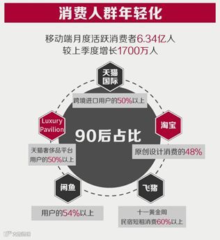 从消费人群、消费结构、消费类型、消费地域等维度看,阿里巴巴均在持续孵化新的消费增长点。年轻人已是消费不断丰富细分的生力军。根据阿里巴巴集团最新的季度报告,移动端月度活跃消费者保持快速增长态势,比上一季增长1700万人。90后“网生一代”现在已全部成年,比起传统的物美价廉,新型消费理念更能打动他们的心。他们买遍全球不差钱,已在天猫国际、天猫奢侈品平台Luxury Pavilion扛起半壁江山。在淘宝最爱为原创设计买单的消费者中,90后占比共计48%;同时,90后也是闲鱼共享闲置的主力。中秋小长假和十一黄金周双双到来,飞猪预订国内高星酒店的一半以上是80后,但各地的特色民宿中,90后分走了60%。90后也比上一代更加习惯于信用消费,中国近1.7亿90后中,超过4500万开通了花呗,平均每4个人中就有1个花呗用户。