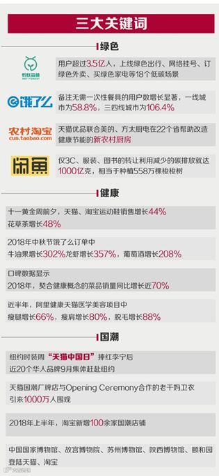 消费升级更生成了越发成熟、自信的新消费文化。比起奢和炫,环保、健康、国潮成为新的关键词。出游季来临,运动装备和健康饮食销售大增四成,饿了么高品质商品订单量不断提升,健康和高端的食品是“宅”的新选择。口碑统计,2018年,契合“轻食”“蔬食”等健康概念的菜品销量同比增长近70%。全球大牌和国货品牌共分秋色,李宁、太平鸟、江南布衣、粒子狂热等登上纽约时装周“天猫中国日”舞台,引发全球关注。泸州老窖、六神、老干妈、颐和园、云南白药等国货品牌大胆跨界,连连制造爆品。2018年上半年,淘宝新增100余家国潮店铺,包括国博、故宫等在内的知名文化机构纷纷与阿里巴巴合作,在天猫、淘宝开店迎客。
