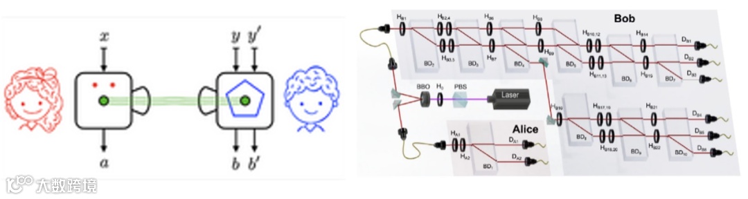以上单婚性关系中,非定域性的测试每次仅考虑Alice和Bob各一个测量的情况。这是一种很自然的假设,但是我们注意到在Bob做互文性测试时每个测量都是与一个与其相容的测量同时进行的。事实上,这种联合测量构成了对该粒子的新的广义测量。那么,这种广义测量带来的新的非定域性与互文性之间是否还遵循单婚性关系?为了回答这一问题,薛鹏教授课题组及合作者首先从理论上严格证明了非局域性和互文性之间并不存在严格的单婚性关系,也就是CHSH不等式和KCBS不等式可以同时被违背。如图所示,Alice和Bob共享一对纠缠光子,通过选取合适的可观测量对Alice和Bob联合测量来验证CHSH不等式的违背;通过五个两两相互相容的可观测量,测量Bob的光子来验证KCBS不等式的违背。实验发现,在非局域性的观测中如果对Bob处的测量不是单个测量,而是相容的联合测量,则可以实现CHSH和KCBS不等式的同时违背,即同时验证了量子体系的非局域性和互文性。
