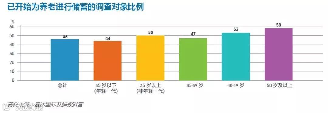 仅有约44%的年轻受访者已经开始为养老退休存钱。在没有开始养老储蓄的受访者中,他们计划开始储蓄的平均年龄是40岁,距离理想的退休年龄57岁,只有17年的时间来储备资产。