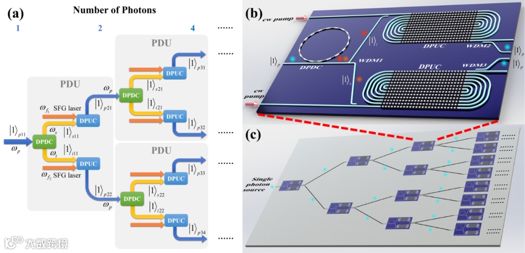 该方案的核心是一种LNOI芯片上的光子倍增模块,它可以实现单光子到双光子的确定性转化,同时保持光子频率不变。通过级联这一模块,就可以实现多光子态的确定性产生(图1)。在此过程中,最难的是实现单光子的确定性“一变二”。此前,在二阶非线性和三阶非线性材料中,研究人员探讨了单光子“一变二”的一些理论方案,但都是基于理想的材料参数假设。该研究中,在考虑现实光学材料参数的前提下,提出了首个有望真正实验实现这一过程的方案设计。
