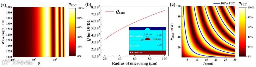 图2 (a)下转换效率ηPDC与Q的关系。(b)DPDC所需的Q与微环半径R之间的关系。插图为LNOI波导横截面结构。(c)不同波导长度l与和频激光功率PSFG1下的上转换效率ηPUC