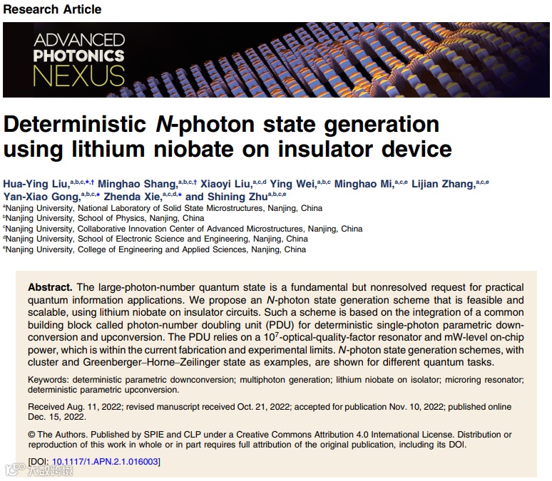 近日,南京大学固体微结构物理国家重点实验室的谢臻达教授、龚彦晓教授和祝世宁院士团队提出了一种大规模光子态制备的新方案,通过理论计算和模拟证明利用薄膜铌酸锂(LNOI)光子芯片有望实现多光子态的确定性产生。这是首个考虑现实光学材料参数,而非理想材料参数条件下实现确定性多光子态产生的理论方案,因而对于未来最终实现大规模光子态制备具有指导意义。相关成果以“Deterministic N-photon state generation using lithium niobate on insulator device”为题发表在Advanced Photonics Nexus 第2卷第1期上。
