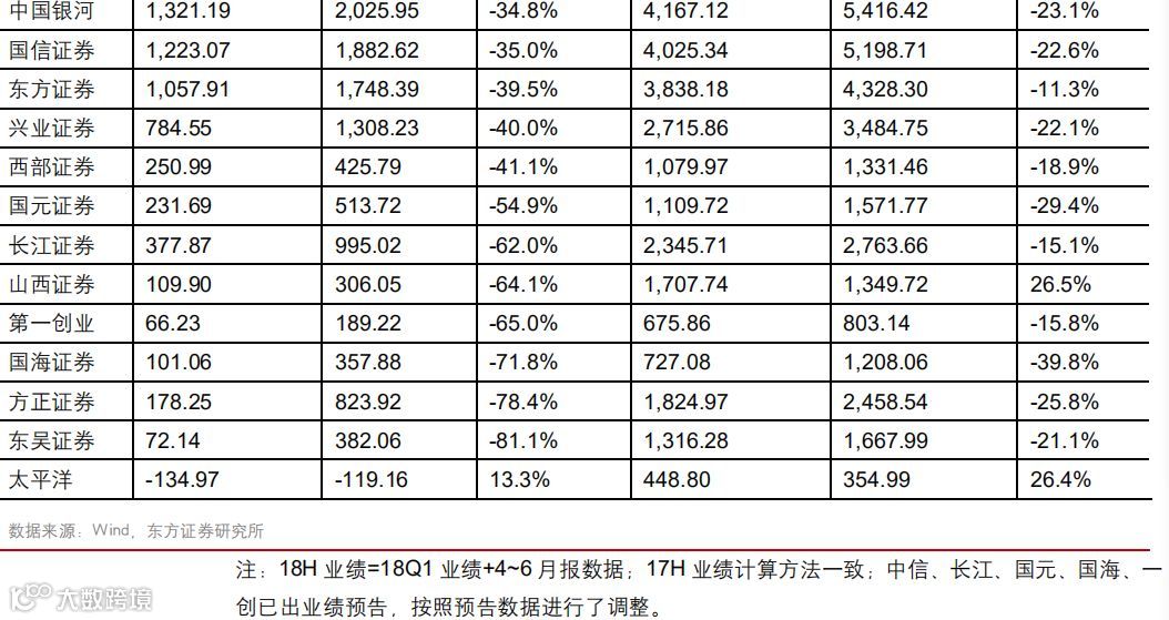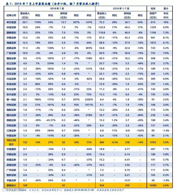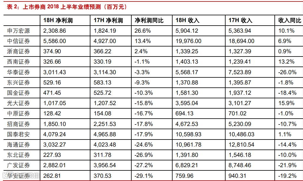 8 月 1 日,证券业协会发布《中国证券业协会发布证券公司 2018 年上半年度经营数据》,证券公司未经审计财务报表显示,营业收入方面,2018 年上半年 131 家证券公司实现营业收入 1265.72 亿元,同比下滑 11.92%;净利润方面,2018 年上半年 131 家证券公司当期实现净利润 328.61 亿元,同比下滑 40.53%。证券行业业绩同比下滑再次加速。