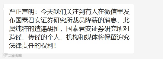 国泰君安官方随后发布正式声明称,今天我们关注到有人在微信里发布国泰君安证券研究所裁员降薪的消息,此属纯粹的造谣胡扯,国泰君安证券研究所对造谣、传谣的个人、机构和媒体将保留追究法律责任的权利!