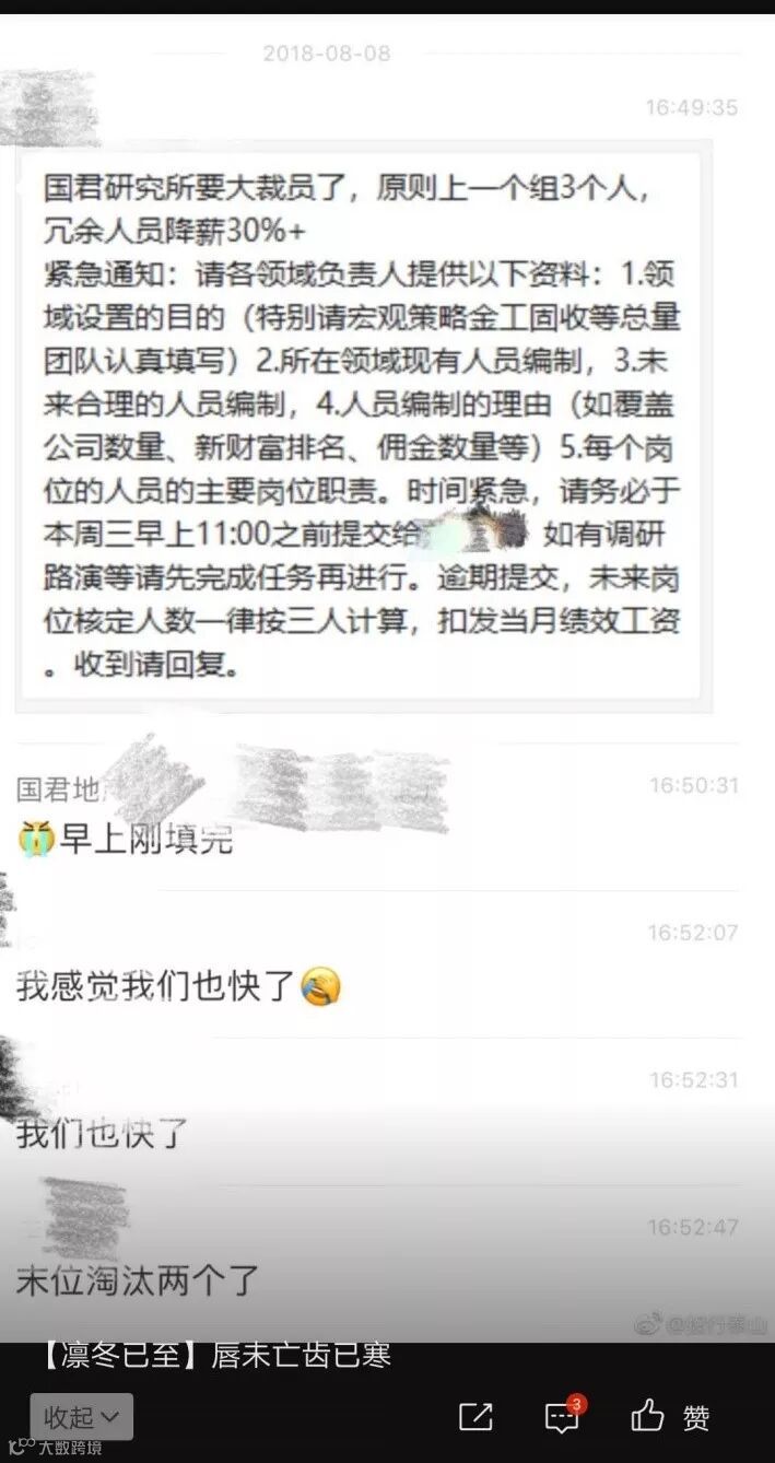 网上流传的微信截图称,国君研究所要大裁员了,原则上一个组3个人,冗余人员降薪30%+。
