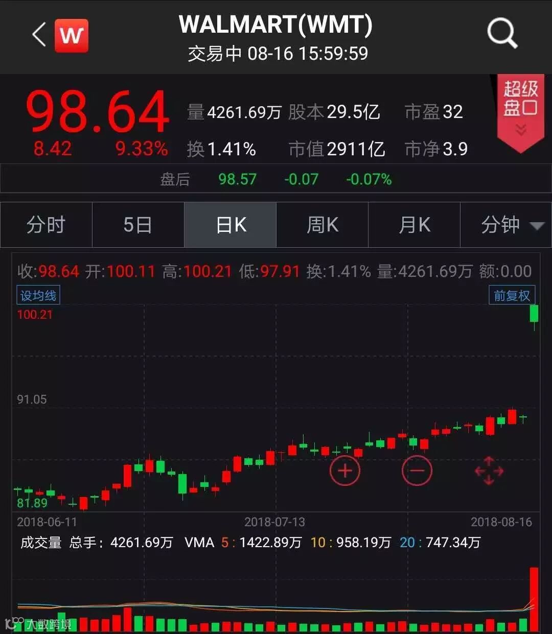 北京时间8月16日晚间, 沃尔玛因百货业务推动营收实现十多年来最强劲增长,股价一度跳涨11%,创下2008年10月以来最大盘中涨幅。至收盘,股价上涨9.33%,报98.64美元。