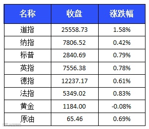 美三大股指周四上涨,道指涨近400点,创4月以来最大涨幅。标普500指数涨22.32点,涨幅0.79%,报2840.69点。道琼斯工业平均指数涨396.32点,涨幅1.58%,报25558.73点。纳斯达克综合指数涨32.40点,涨幅0.42%,报7806.52点。