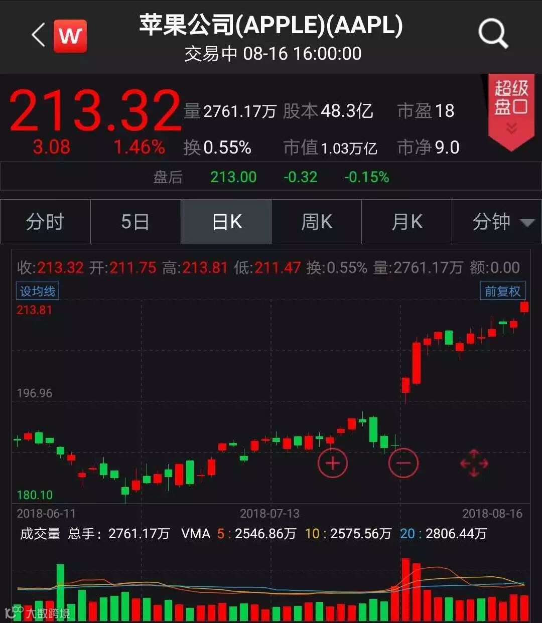 苹果股价周四上涨1.46%,报213.32美元,再创收盘历史新高。