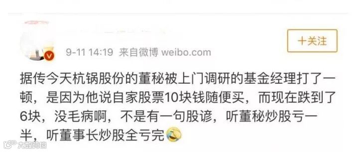 今日(9月11日)下午,一则网络传言刷爆了朋友圈,给低迷的股市注入了一剂黑色幽默:杭锅股份董秘濮卫锋被前来调研的研究员和私募给暴揍了,原因是因为董秘说自家股票10元随便买,结果股票跌到了6元。