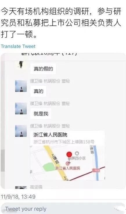其次,网上的聊天记录和在医院的定位都显示我被打的住院了。“我承认截屏里群聊天说话的是我,不过是被人断章取义了。这其实是我在浙江上市公司董秘群里开的一个玩笑。”