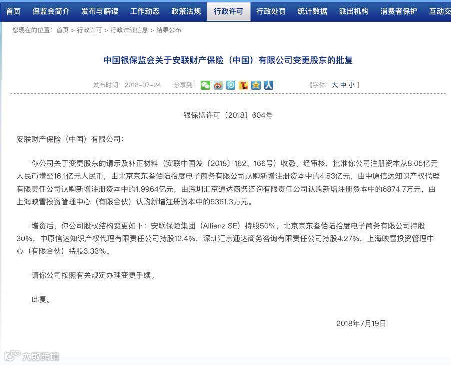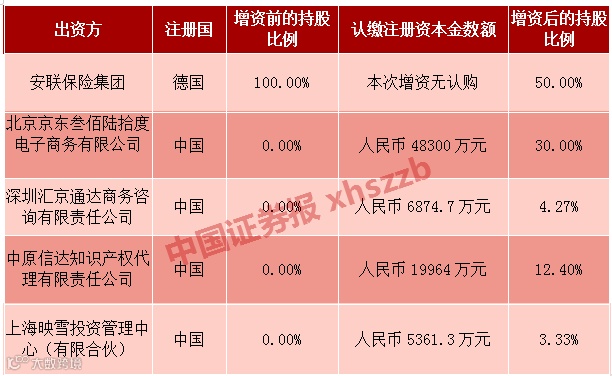 其中,北京京东叁佰陆拾度电子商务有限公司(简称“京东”)认购新增注册资本中的4.83亿元,增资后持股达30%;中原信达知识产权代理有限责任公司认购新增注册资本中的1.9964亿元,增资后持股12.4%;深圳汇京通达商务咨询有限责任公司、上海映雪投资管理中心(有限合伙)分别认购新增注册资本中的6874.7万元、5361.3万元,增资后持股比例分别为4.27%、3.33%;安联保险持股比例则由100%降至50%。