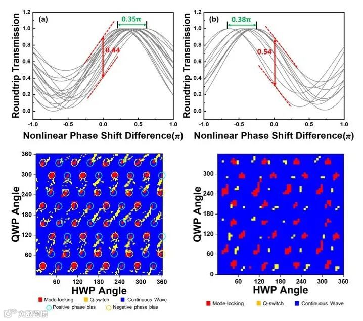 图1、上图展示的是参数空间中可支持锁模状态的腔非线性响应曲线所形成的优化区域(分正相移区和负相移区)。下图展示的是快速扫描获得的激光器全参数空间状态分布图(具有每24小时完成100万个状态的高速分析能力)。