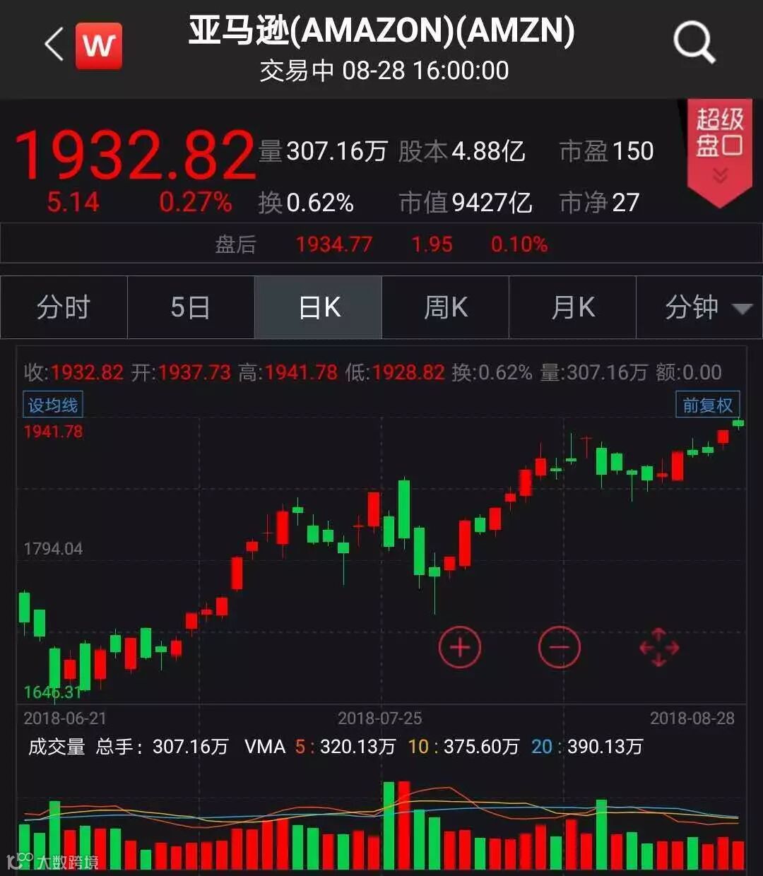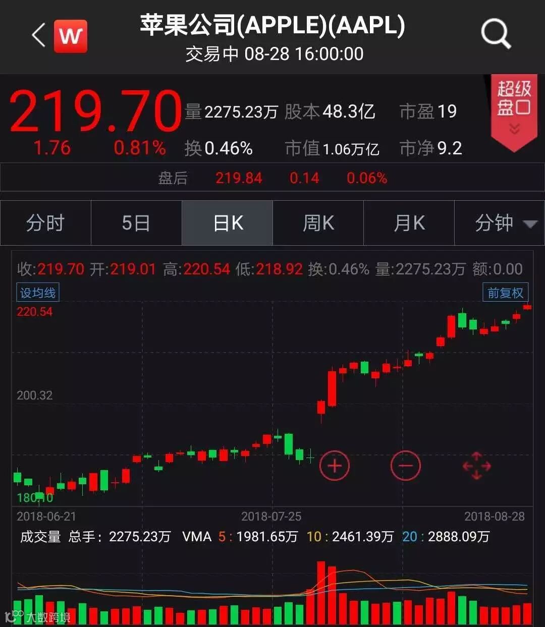苹果股价周二上涨0.81%,刷新收盘历史高位至219.70美元,市值1.06万亿美元。亚马逊股价上涨0.27%,刷新收盘历史高位至1932.82美元,市值9427亿美元。