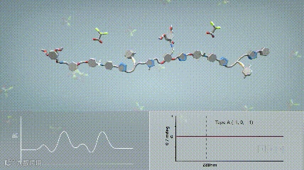 此外,作者还研究了以脉冲化学燃料(三氯乙酸)驱动分子棘轮自动地读取信息。他们发现,将过量的化学燃料三氯乙酸加入到条带1、大环3、屏障分子4、5、6以及三乙胺的混合溶液中,酸性燃料会质子化分子带上的BMBA基团,使得大环从溶液中(State 0)泵入到分子带上(State I),信息被读为-1。一段时间后,随着酸性的三氯乙酸降解生成氯仿和二氧化碳,溶液则会呈现碱性,此时溶液的CD谱图与MT-7类似,信息被读为0。加入第二份化学燃料后,CD谱图发生变化,得到刚好与State I相反的Cotton信号,信息被读为+1。第二份燃料经过两天的降解被消耗完,溶液回到碱性,此时大环从分子带上完全脱落,回到体系的初始状态State 0。
