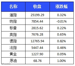 美股周三收盘涨跌不一。标普500指数涨6.07点,涨幅0.22%,报2815.62点,创2月1日以来收盘新高。道琼斯工业平均指数涨79.40点,涨幅0.32%,报25199.29点,创6月13日以来收盘新高。纳斯达克综合指数下跌0.68点,跌幅0.01%,报7854.44点。