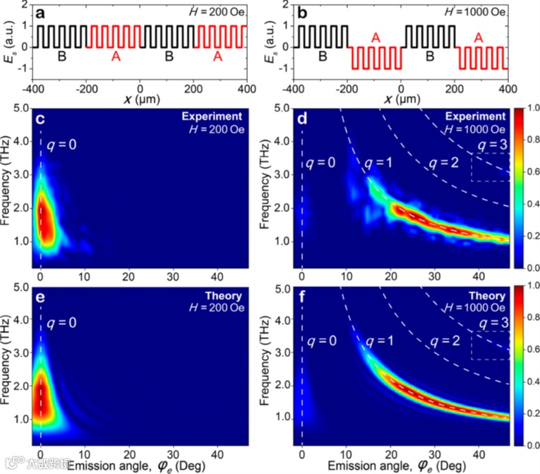 为了独立控制A、B两种类型铁磁层的磁化方向,研究团队在A类型异质结构的铁磁层下预先生长了反铁磁薄膜,由于铁磁与反铁磁界面的交换相互作用,A类型铁磁薄膜的矫顽场得到了明显的增大,磁化翻转需要更大的磁场。由于逆自旋霍尔效应,在小磁场下,A、B两种类型“格子”磁化方向相反,自旋流方向相反,产生的横向电荷流方向相同,超构表面形成的超线栅周期较小,太赫兹辐射集中于正出射;而在大磁场下,两者磁化方向相同,横向电荷流的方向相反,超线栅的周期等于“超格子”的周期,太赫兹辐射集中于一级衍射,并产生了空间色散,如图2所示。这样就通过磁场大小成功调控了太赫兹辐射的出射方向,实现了光束转向,转向角的大小依赖于超构表面形成的“超格子”的周期。