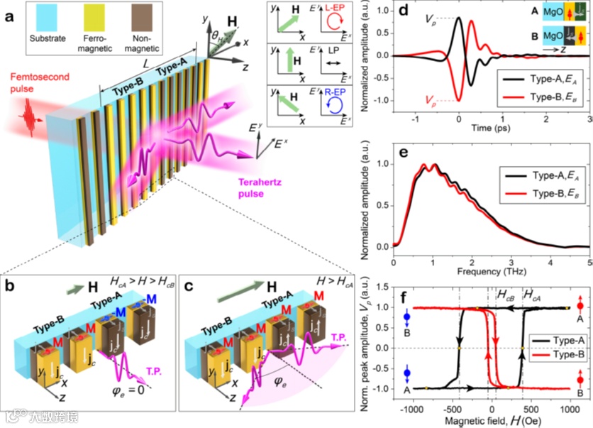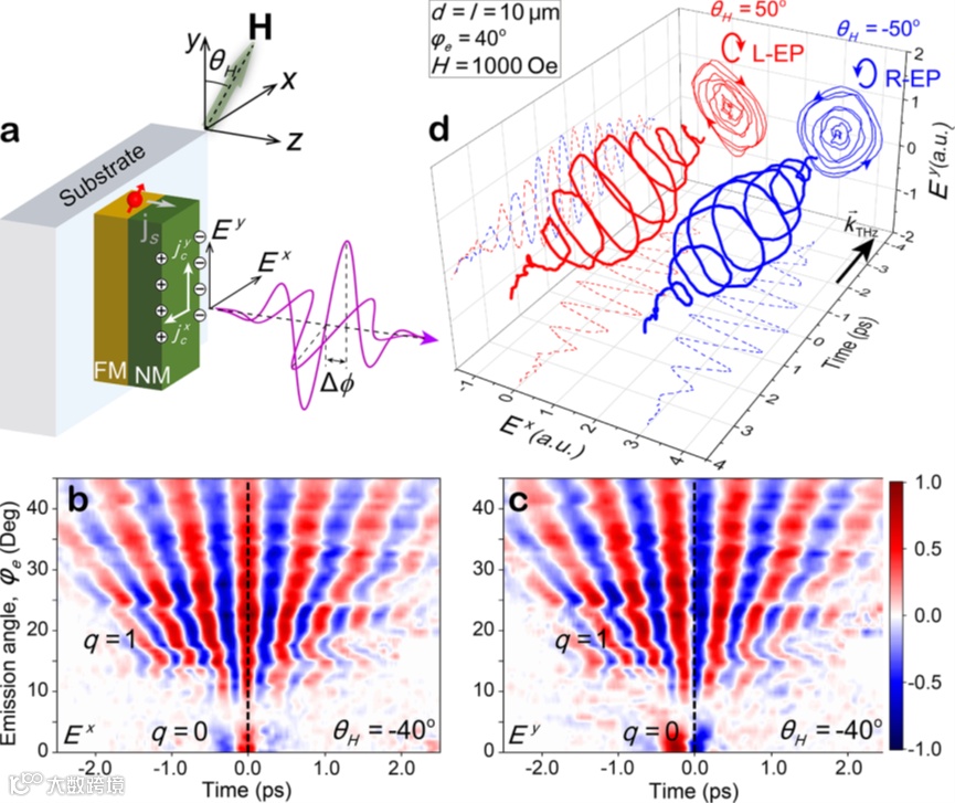 纳米级厚度的铁磁/非磁重金属异质结薄膜组成的自旋电子学太赫兹发射源,具有发射效率高,频谱覆盖广的优点。当飞秒激光脉冲激发铁磁层产生非平衡自旋流后,自旋流进入非磁重金属层中,由于非磁重金属中的较强的自旋轨道耦合,会发生逆自旋霍尔效应,自旋流会转换成横向电荷流,进而产生太赫兹辐射,所产生的太赫兹辐射的偏振方向垂直于铁磁层的磁化方向,可以通过外加磁场的方式调控辐射太赫兹的偏振态。此外,结合成熟的金属薄膜微纳加工工艺,由金属纳米薄膜制成的自旋电子学太赫兹发射源也更容易加工成超构表面,从而实现集成的太赫兹的产生和光束调控。