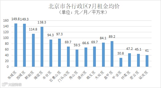 分区域来看,7月东西城均价均已接近150元/月/平方米。除城六区外,大兴区和昌平区近郊区域均价也接近90元/月/平方米。其中7月通州租金均价同比上涨接近40%。