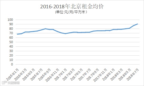 诸葛找房的数据显示,2016年-2018年4月,北京租房均价大体在70元/月/平方米-80元/月/平方米之间波动,5月、6月的房租均价分别为80.5元/月/平方米、86.4元/月/平方米,7月更是一举站上90元/月/平方米,达到了90.12元/平方米,环比上涨4.3%,同比上涨25.8%。