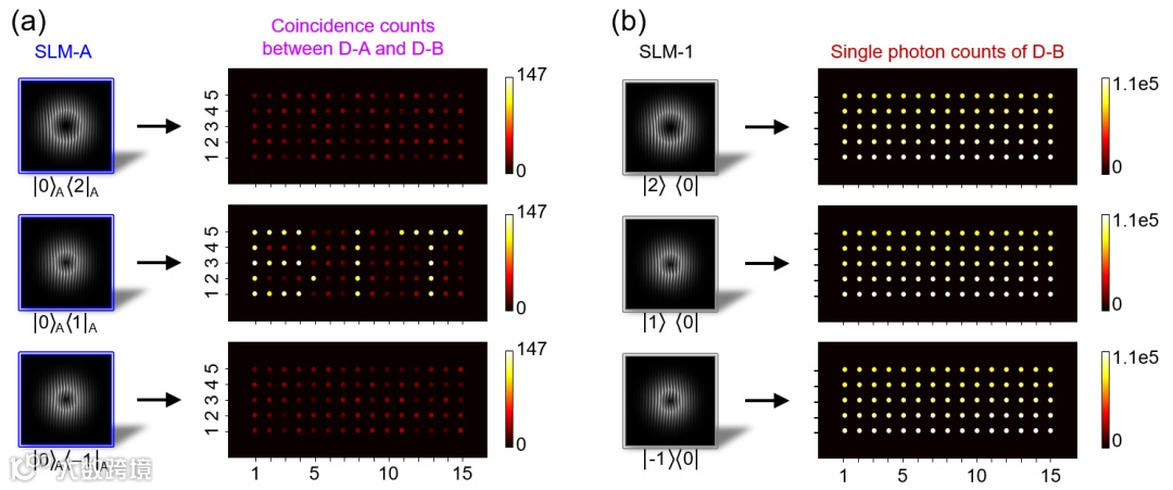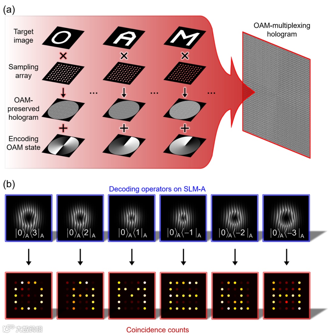 图1. 高维轨道角动量纠缠量子全息方案示意图(a)及其测量结果(b)。