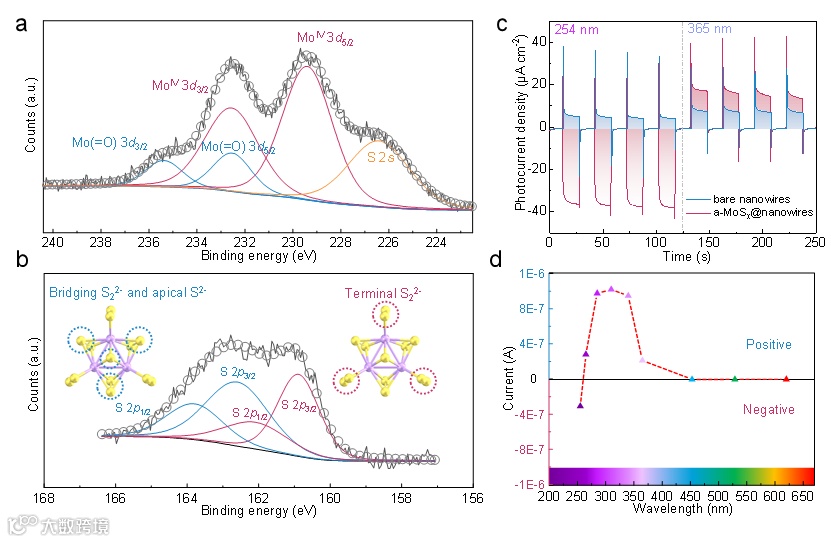 图3 (a)(b) p-AlGaN/n-GaN纳米线上电沉积a-MoSx壳层的XPS谱。(c)a-MoSx修饰前后的光响应对比。(d)a-MoSx@p-AlGaN/n-GaN纳米线的光谱响应。