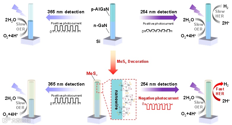 近日,中国科学技术大学龙世兵、孙海定研究团队联合武汉大学刘胜教授团队,以及合肥微尺度国家实验室胡伟研究员、香港城市大学He Jr-Hau教授和澳大利亚国立大学傅岚教授,将分子束外延生长的III族氮化物纳米线与无定型硫化钼材料结合,构筑了新型GaN/MoSx核壳纳米线结构,应用于光电化学光探测领域。通过将氮化镓半导体内光电转化过程与该结构在电解质溶液中的电化学反应过程相交叉,成功在纳米线中观察到光波长控制下的光电流极性翻转现象,实现了不同波长可分辨探测功能。