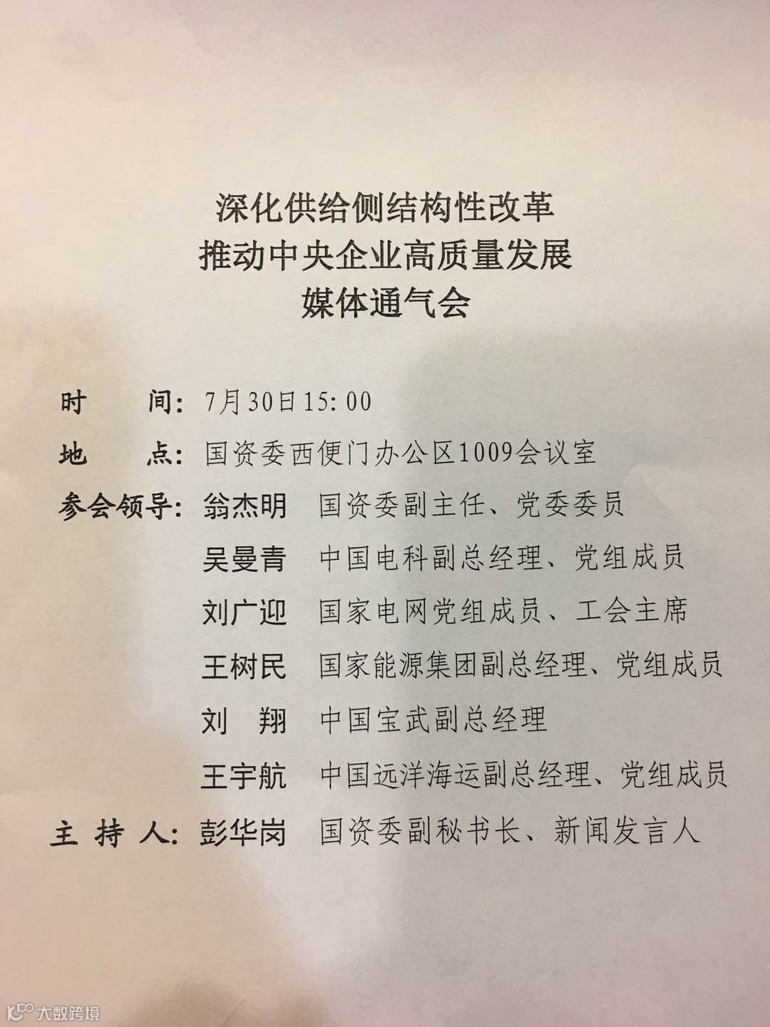 7月30日,国资委召开深化供给侧结构性改革推动中央企业高质量发展通气会。