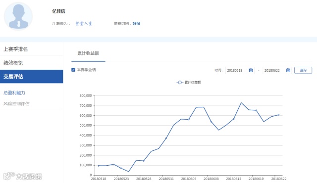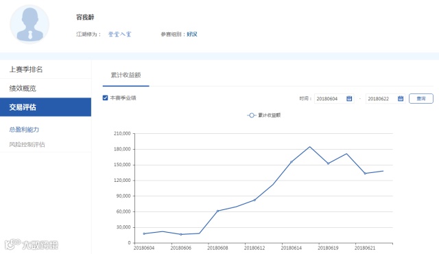 容我醉,6月初报名参赛,在6月7日开始爆发,一波连续7天的重仓盈利使他实现一个月的较大收益。他的目标是今年的冠军,他认为一个月的成绩不足一提,会继续做好自己的交易系统,用胜利和盈利来优化自己的交易状态,实现更大的突破。但毕竟江湖高手众多,本次大赛好汉组也是竞争相当激烈,截止25日,“容我醉”在好汉组排名已经暂时降到第7位。江湖过招,硝烟四起,“容我醉”我们拭目以待。